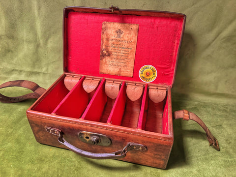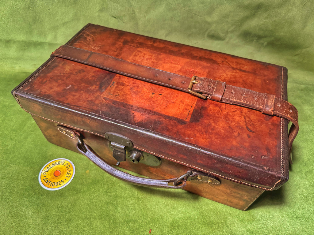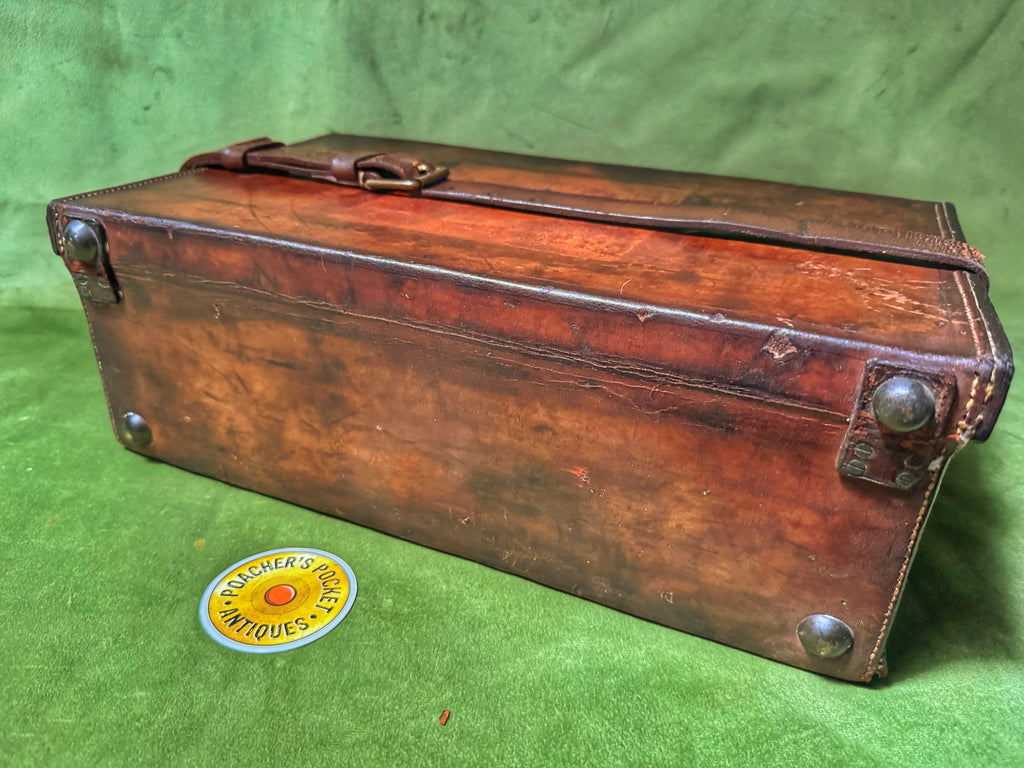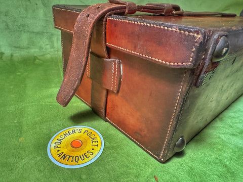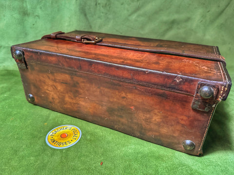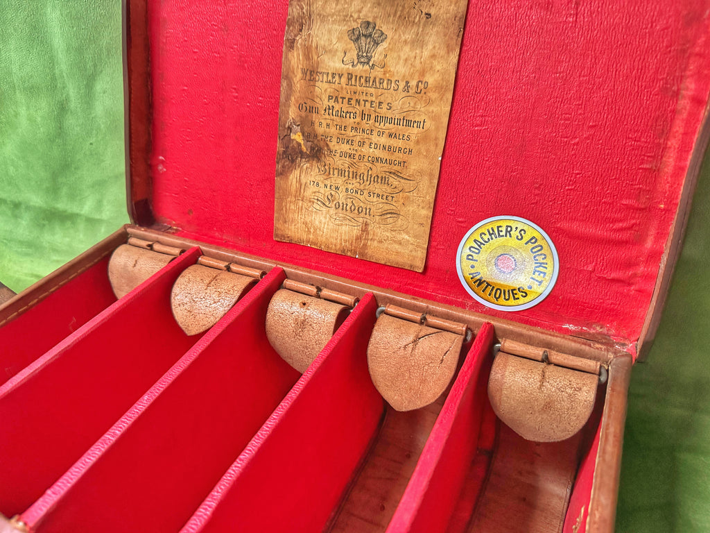A nice piece of leather luggage; would display well in a gunroom or country home. Made to carry 250 cartridges. Baize lined with later W Richards label inside top. All leather lifters present, as is a later leather closing strap.