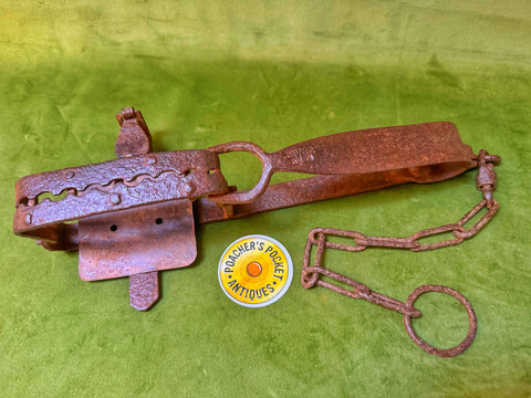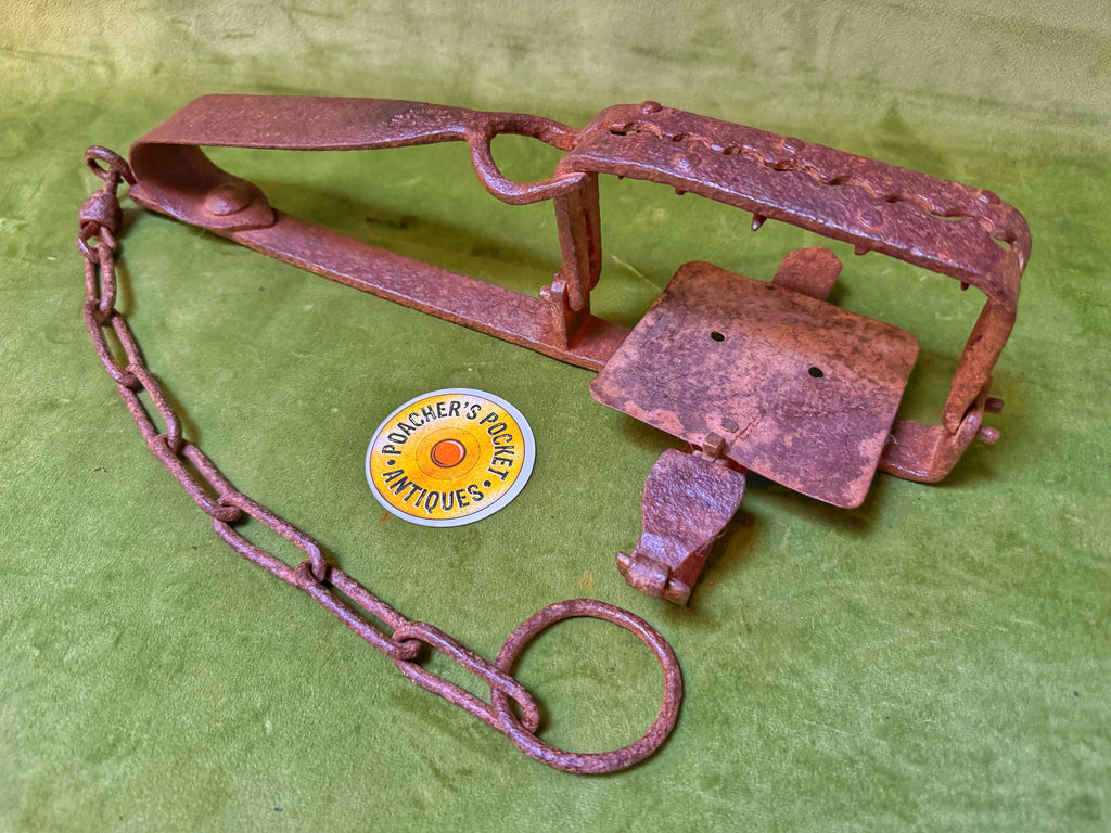 A good trap, stamped SHAVE REGD on the spring, with 6” jaws with additional riveted spike teeth underneath. Plate is thin so might be a modification