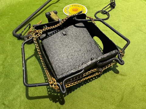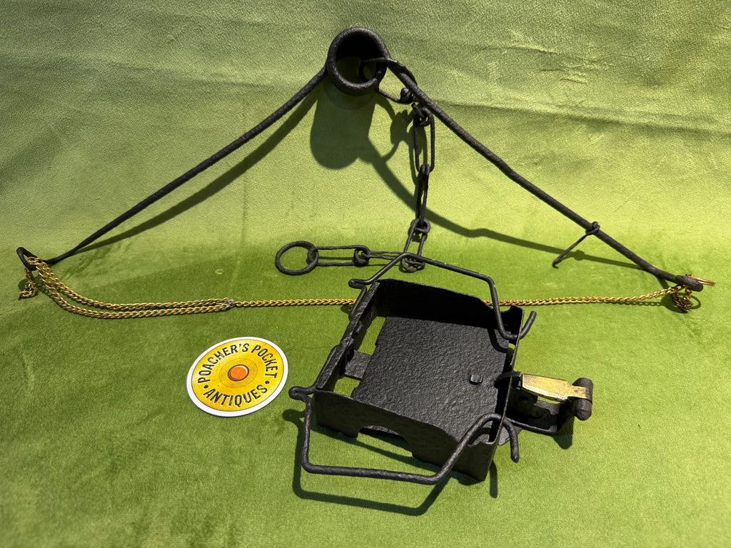 This is the very first one of these we have had in stock. Patented in Devon, this trap, when activated put a chain snare onto the leg of the rabbit or fox to hold it. Trap has been painted black in its life, brass chain snare might not be original.